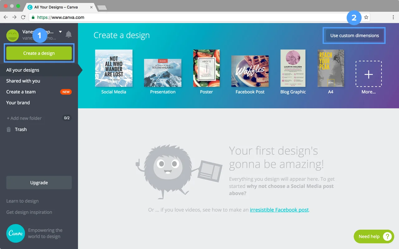 Once you create an account on Canva, click the Canva logo in the top left corner of your screen to start a new project. Then click “Create a Design” and “Use Custom Dimensions”.