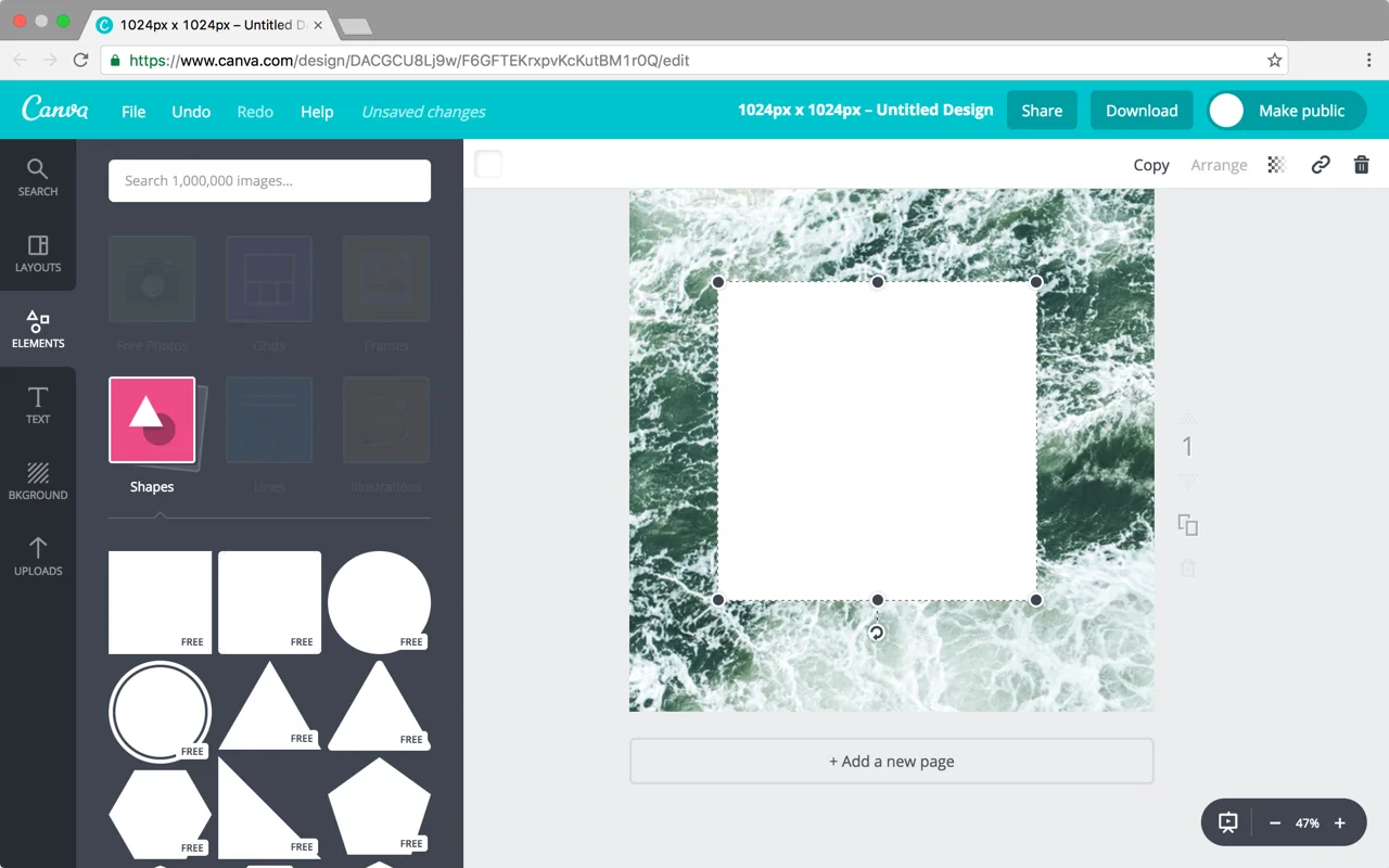 Next, add a tint on top of your background by selecting the “Elements” tab then “Shapes”. Drag the square shape on top of your background and scale it to fill the canvas.