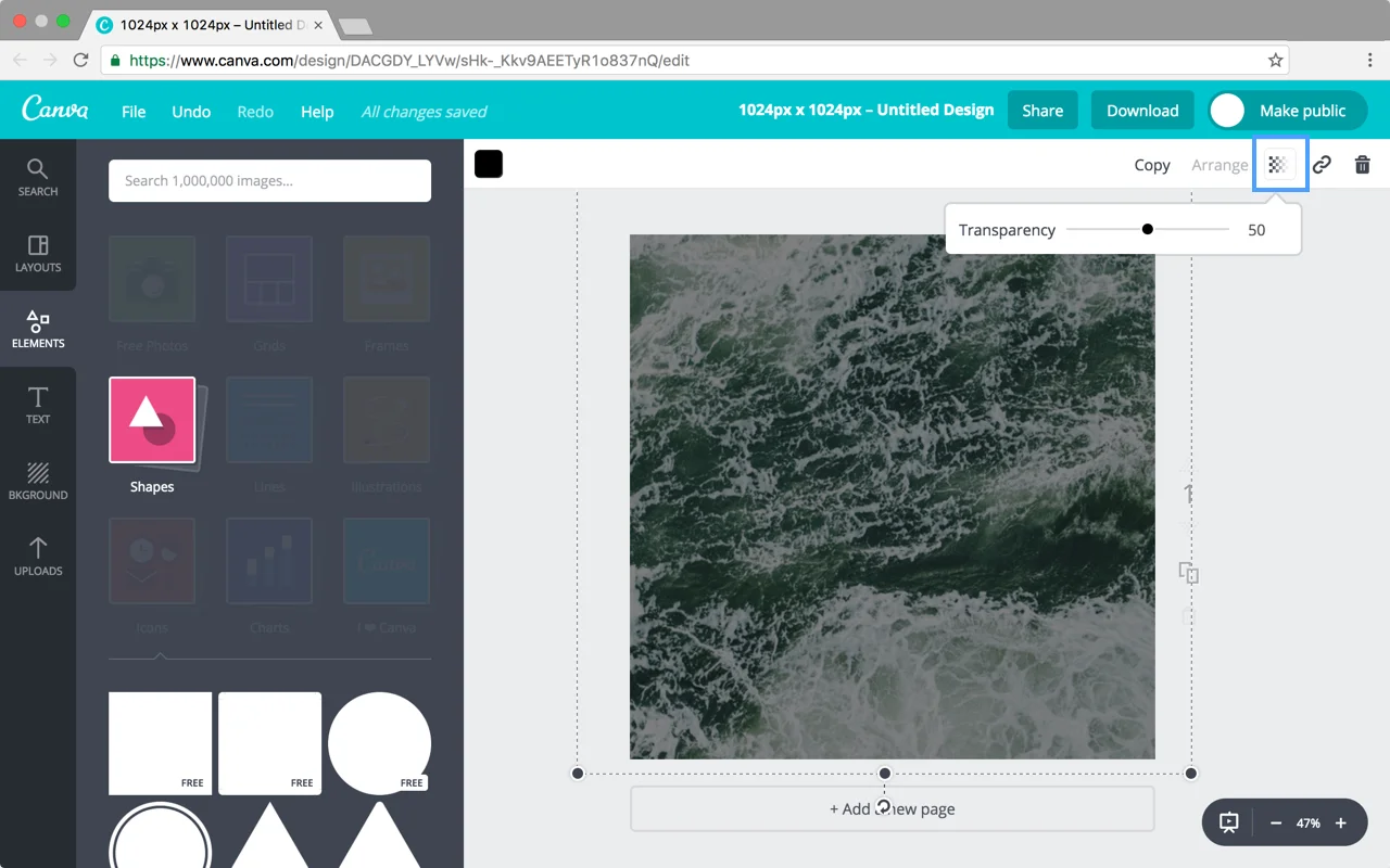 Next, adjust the transparency of that shape to create a tint. Click the checkered icon in the upper right corner of your work area and set the transparency to 50.
